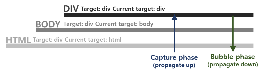 addEventListener는 Target과 Current target이 다른 요소들에게 (예제에서는 BODY와 HTML이 해당한다.) Capture phase에서 실행될지, Bubble phase에서 실행될지 직접 선택할 수 있게 한다.